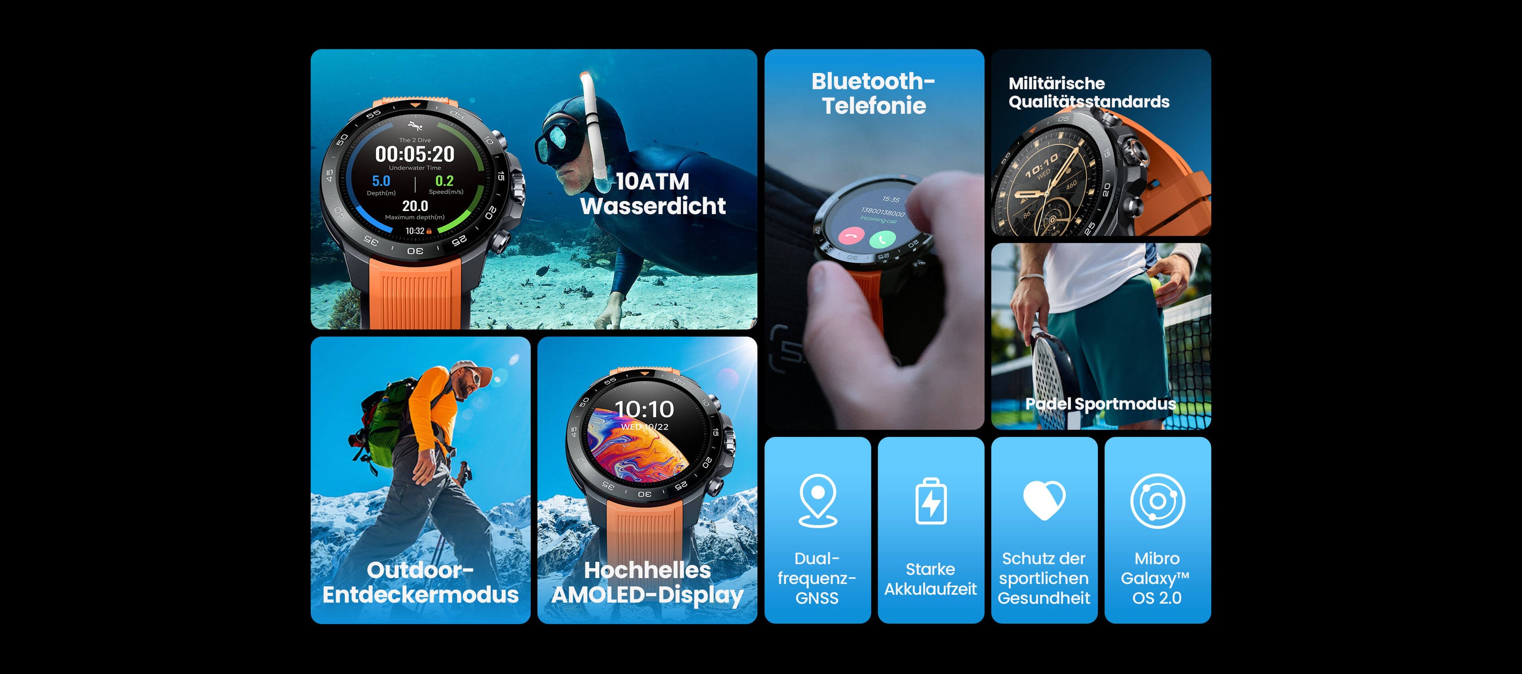 Mibro Galaxy OS 2.0 bietet tiefe Personalisierung (50+ Infokarten), Sync mit Strava/Apple Health/Google Fit und 150+ Sportmodi, inkl. Padel-Schlaganalyse.