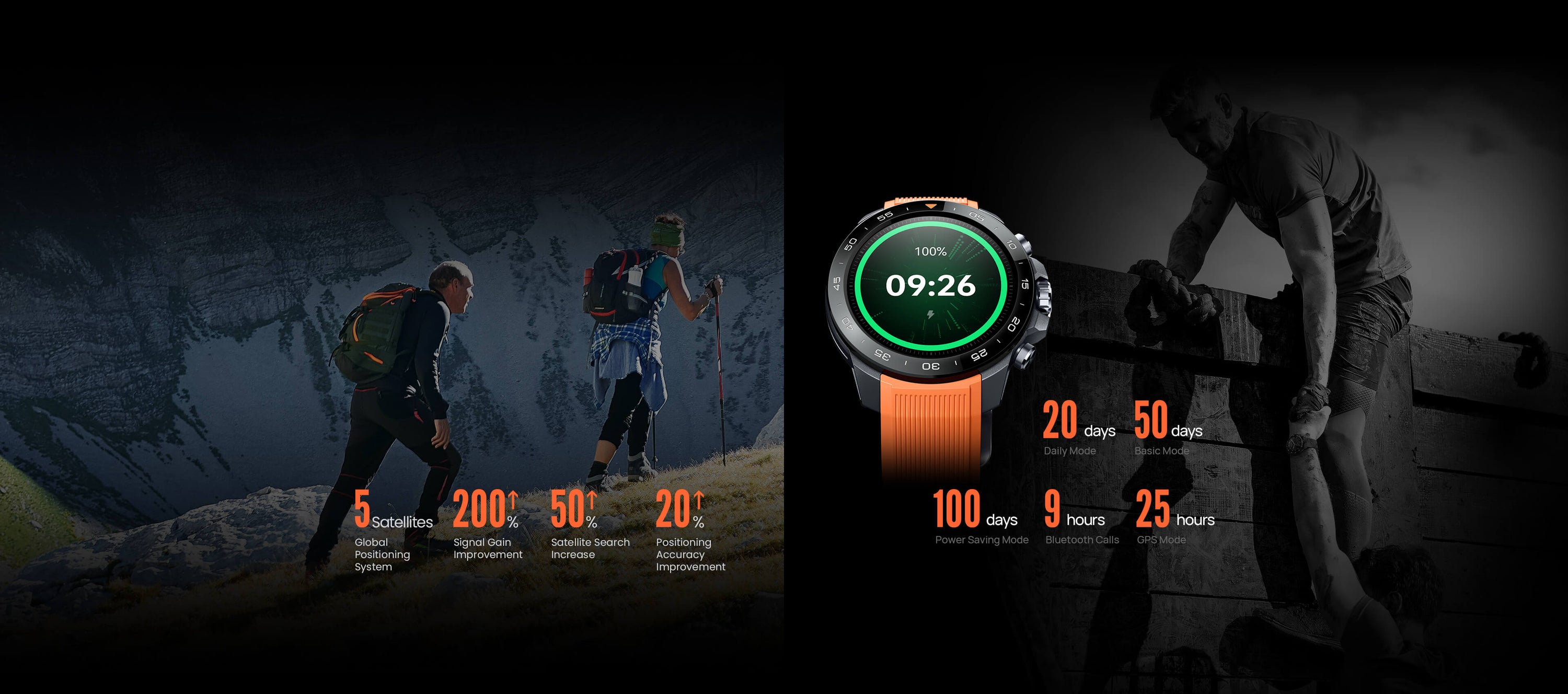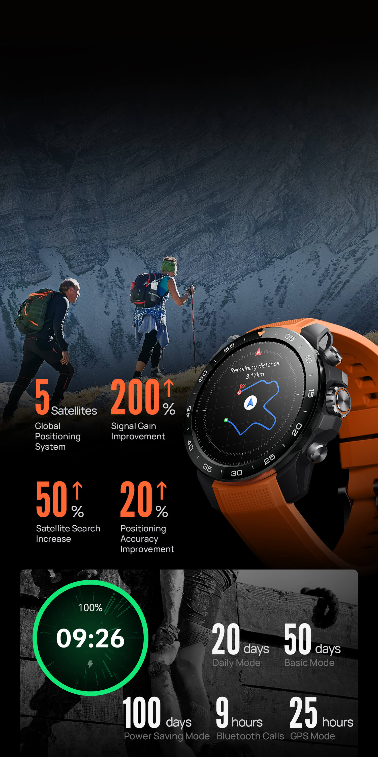 Massive Akkuleistung: 20 Tage (täglicher Gebrauch), 50 Tage (Basis), 25h GPS oder 9h Telefonie.