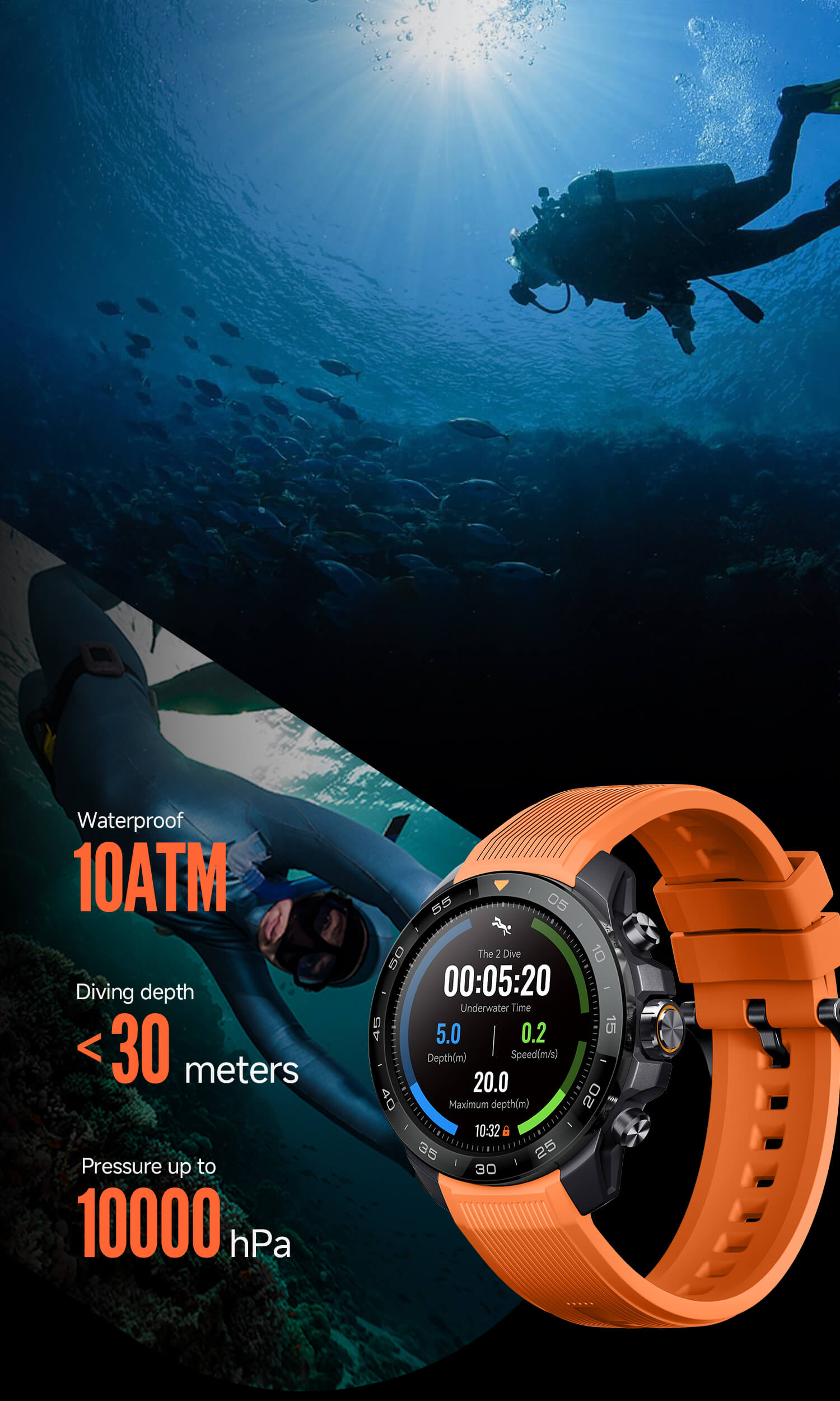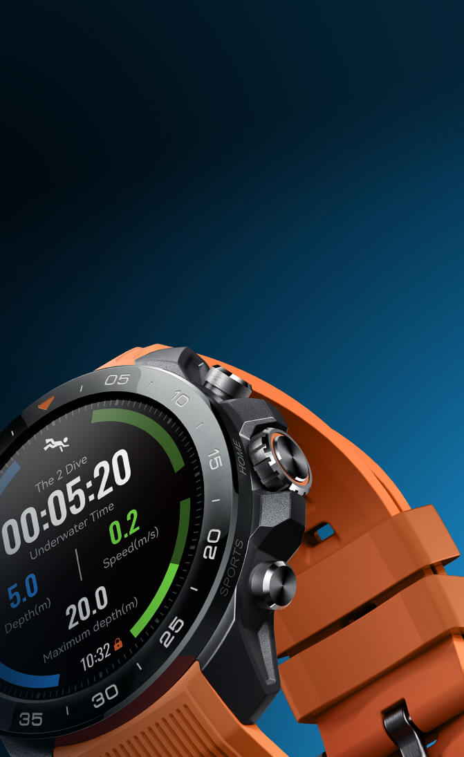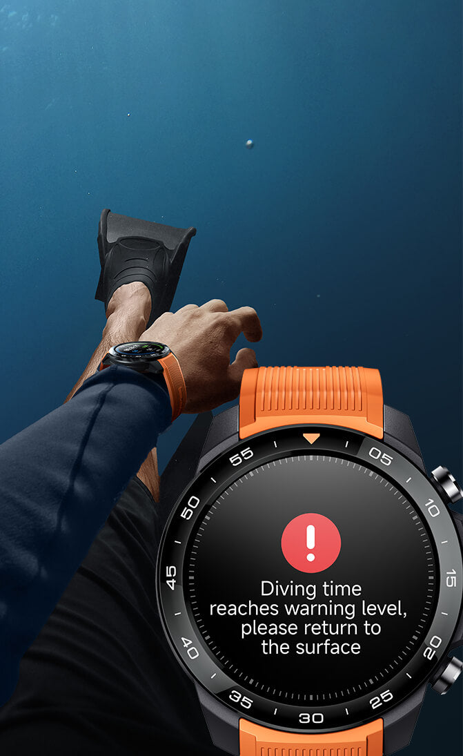 Verfolgen Sie Tiefe (aktuell/max), Auf-/Abstiegsgeschwindigkeit, Tauchzeit und -anzahl in Echtzeit. Stellen Sie benutzerdefinierte Tiefen-/Zeitwarnungen mit visuellen+Vibrationsalarmen ein. Klarer AMOLED-Bildschirm und 3-Tasten-Bedienung funktionieren auch unter Wasser mit Handschuhen perfekt.