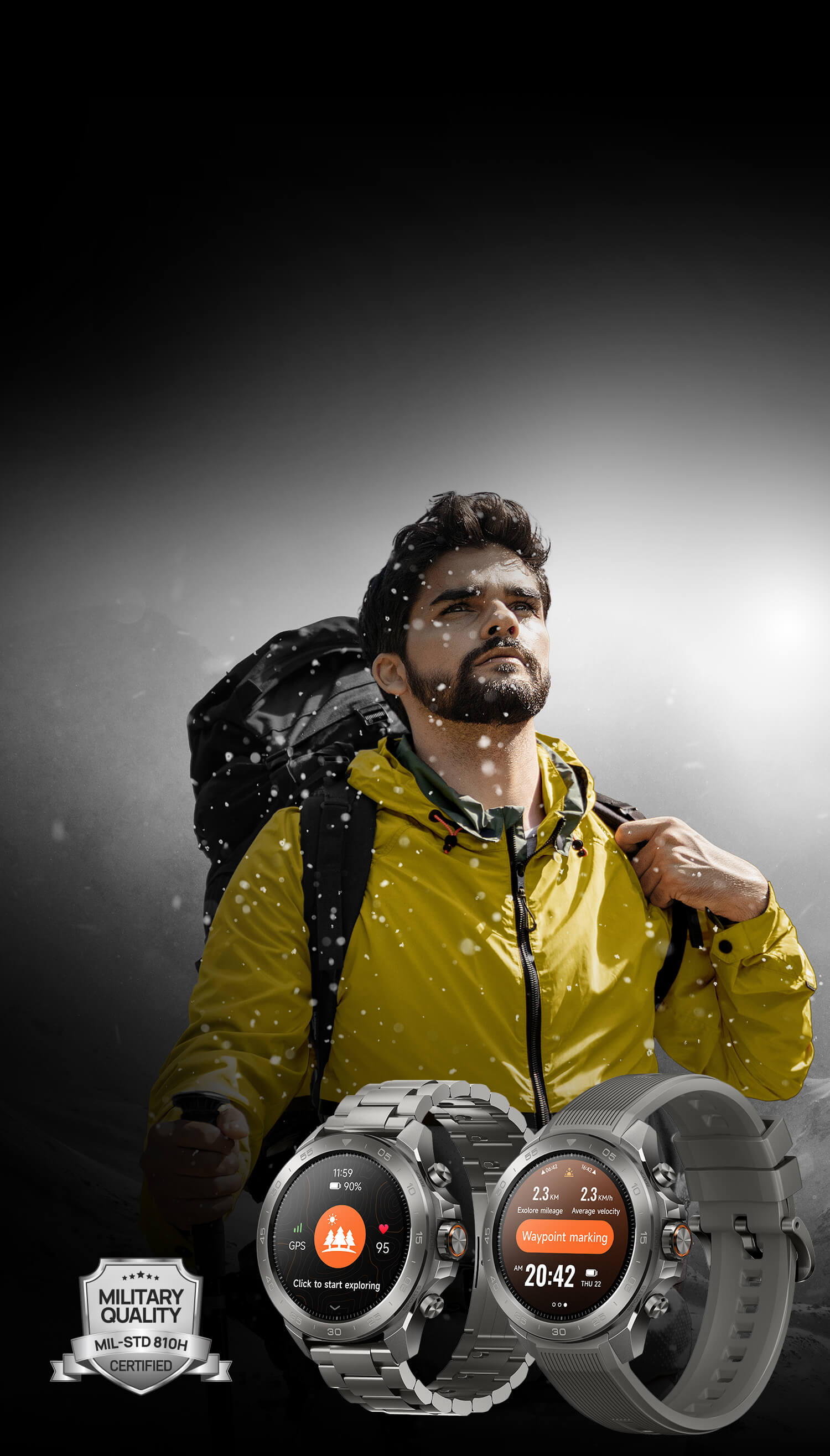 Military-Grade Quality, Freedom to Explore. Complies with 17 military-grade specifications under MIL-STD-810H-2019, ensuring reliable performance whether in scorching deserts, humid rainforests, snowy peaks, or polar ice sheets.