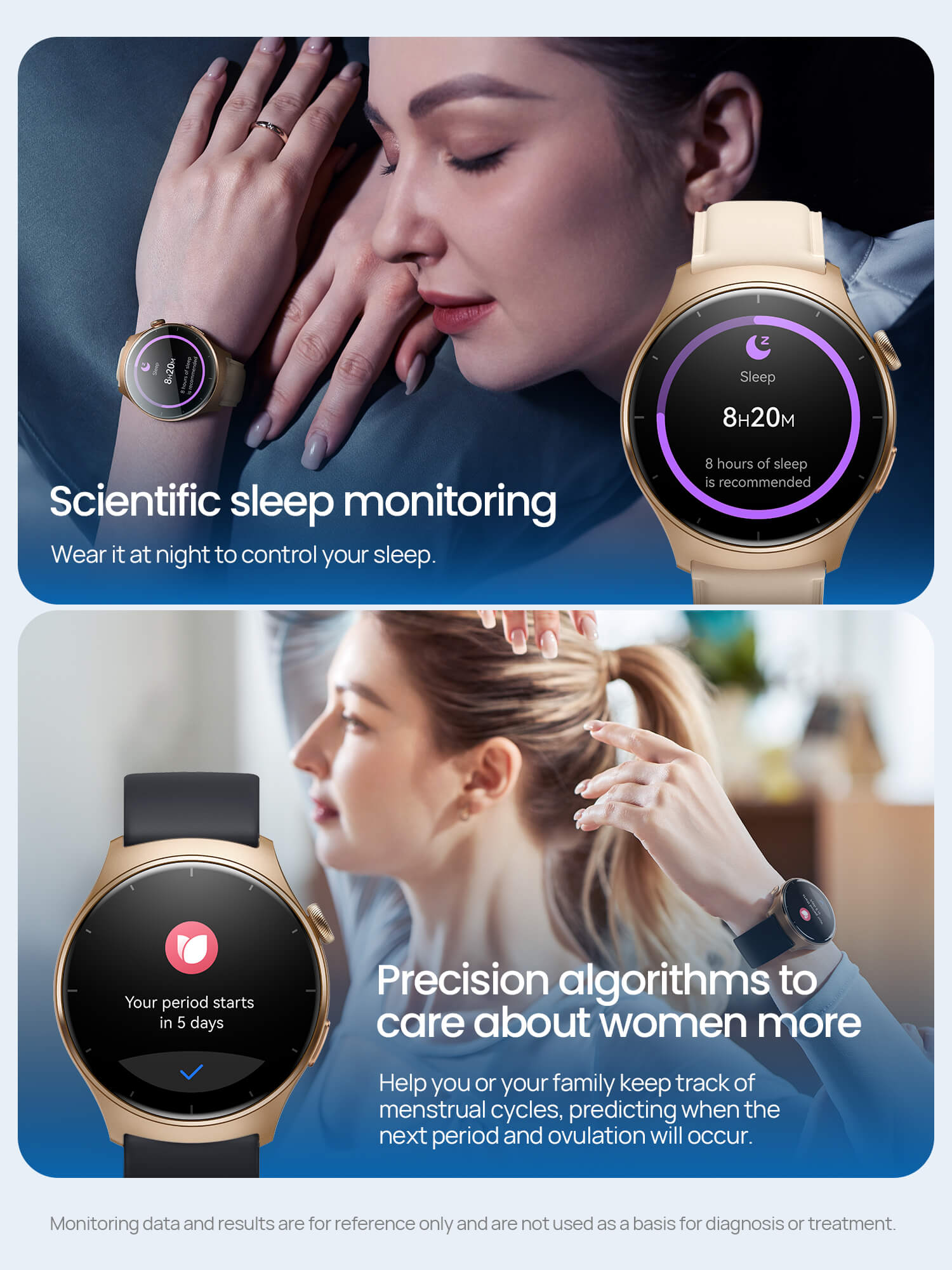 24/7 monitoring of heart rate, oxygen levels, stress, and sleep, with alerts for abnormal readings and women health care.