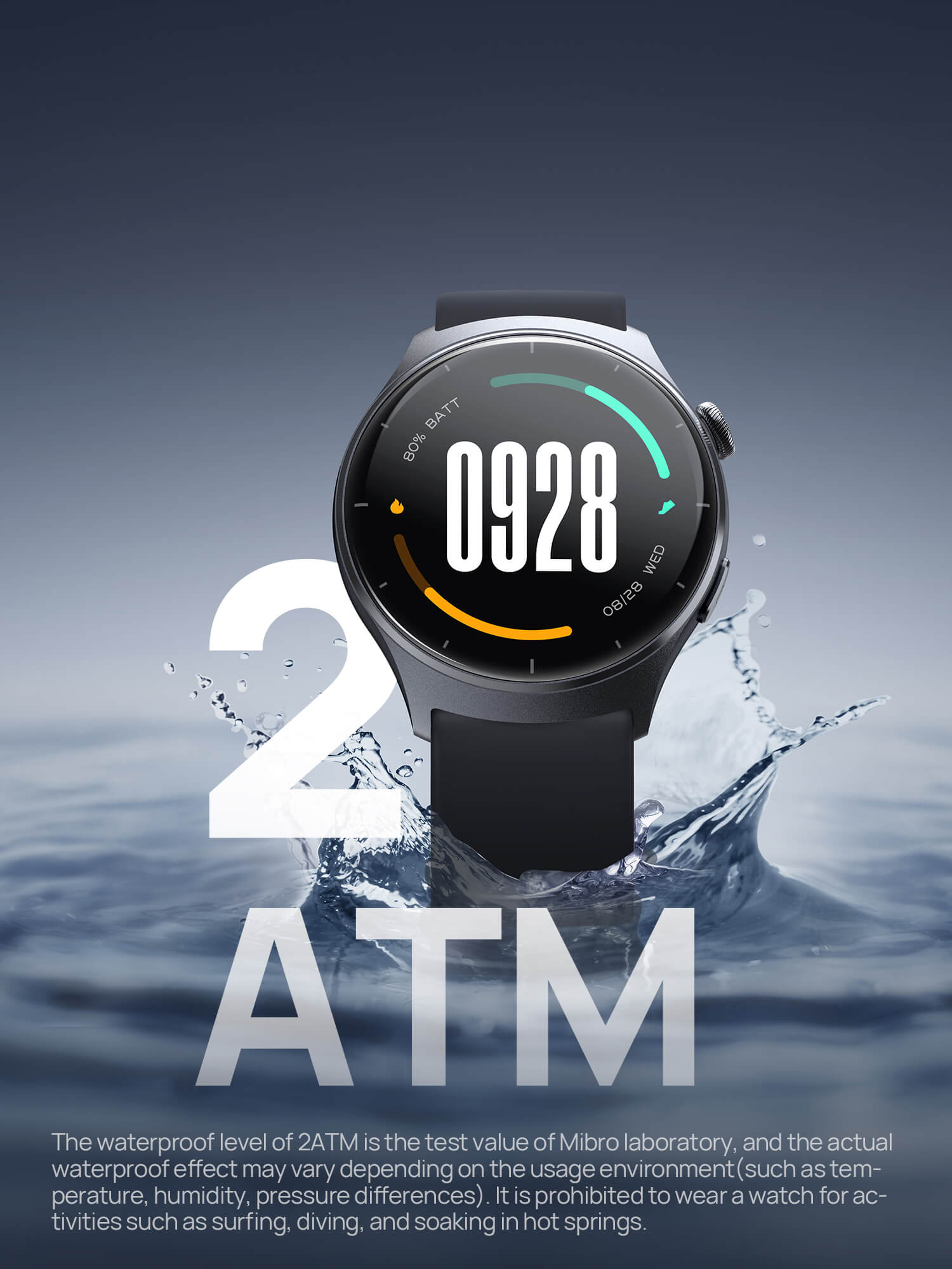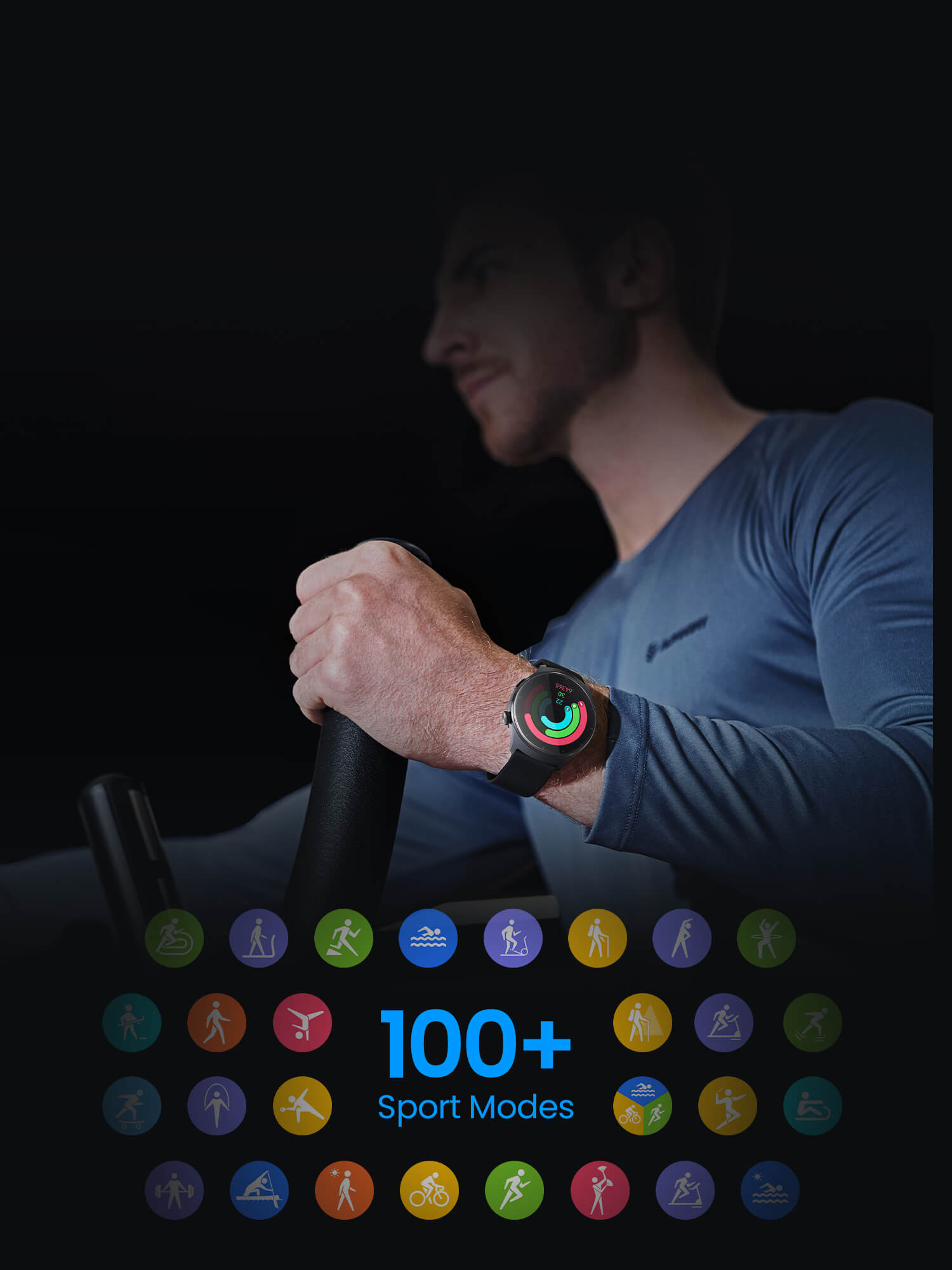 100+ sports modes powered by professional motion algorithms. 2ATM waterproof supports professional swimming mode.